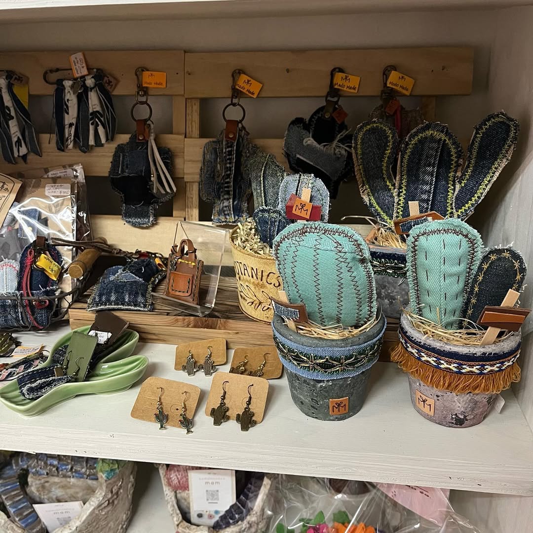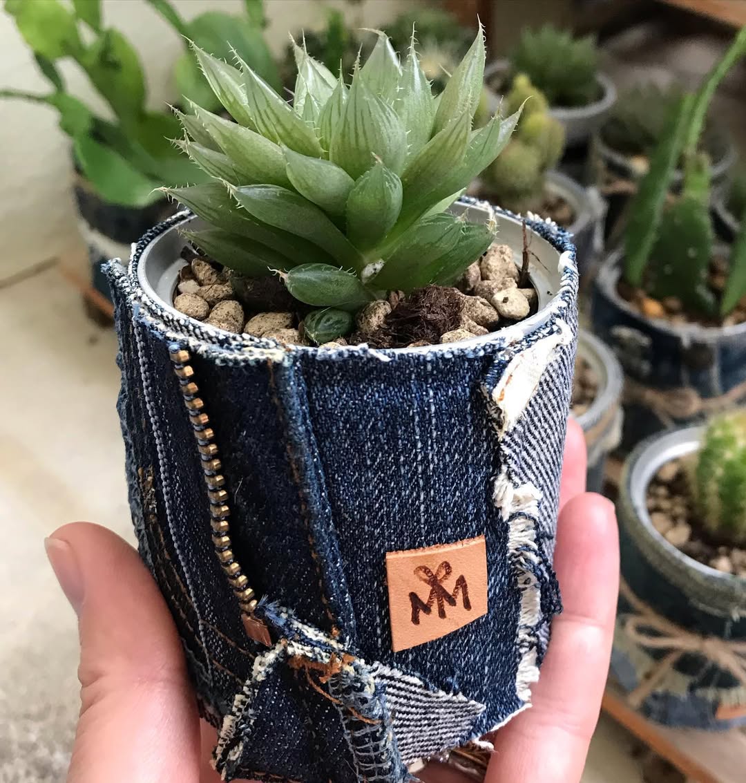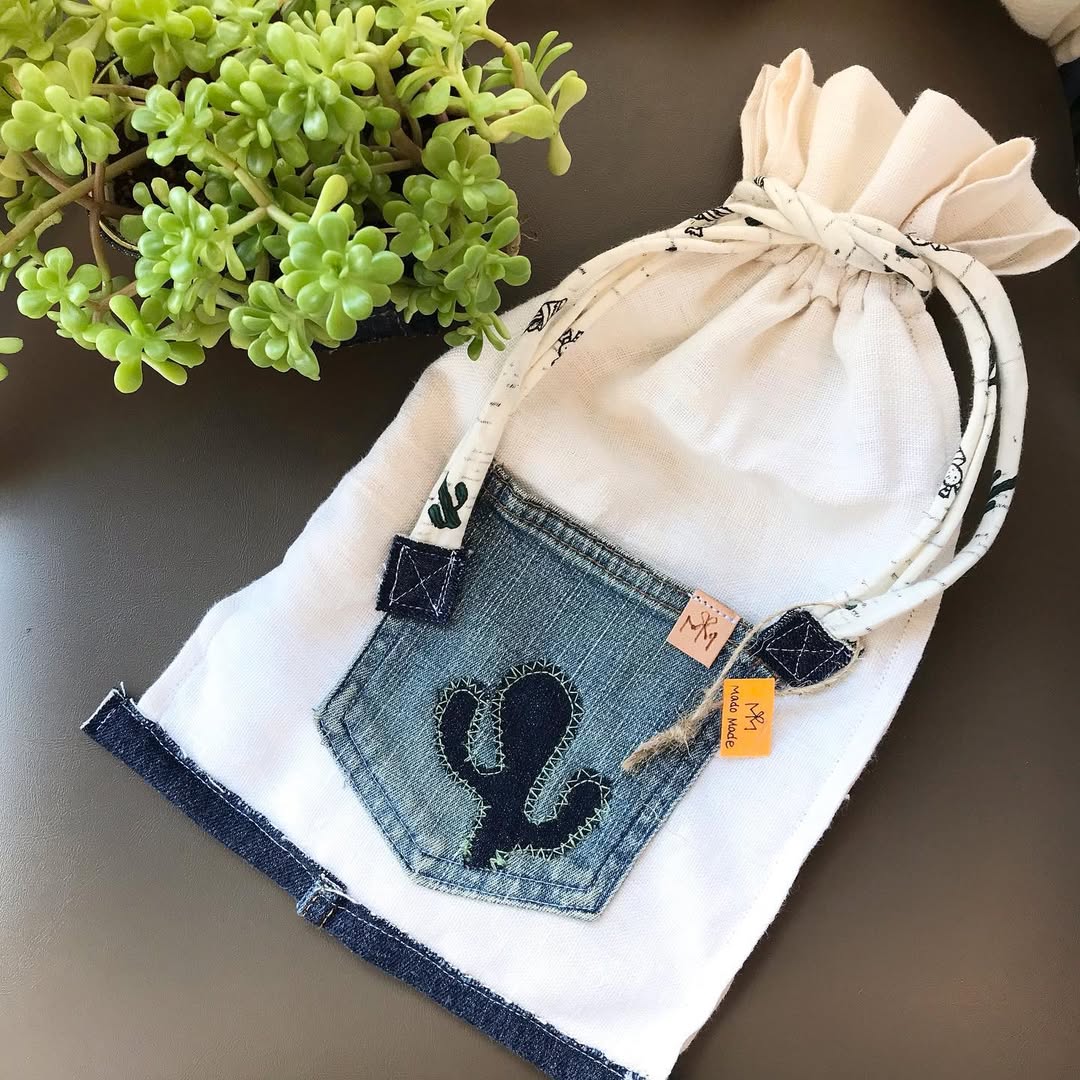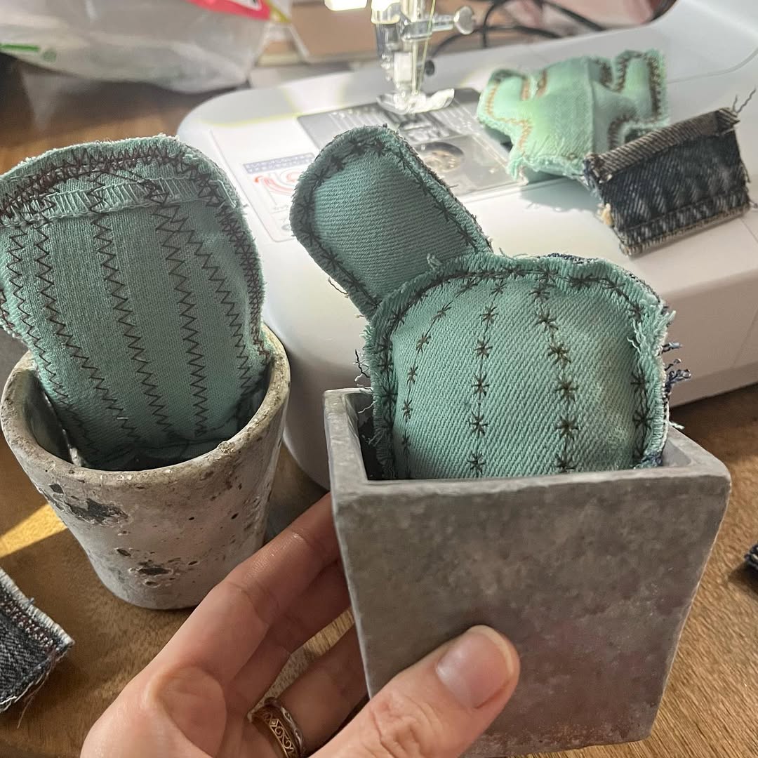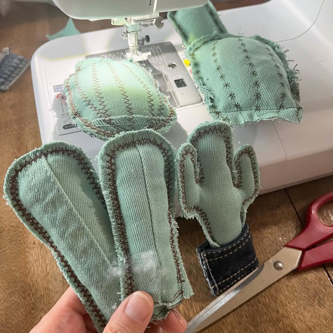 グリーンのデニムで「チロリンリボン巻きのセメント鉢サボテン」と、「サボテンキーホルダー」を制作(゚ω゚)
