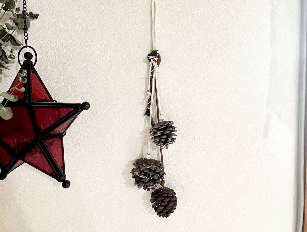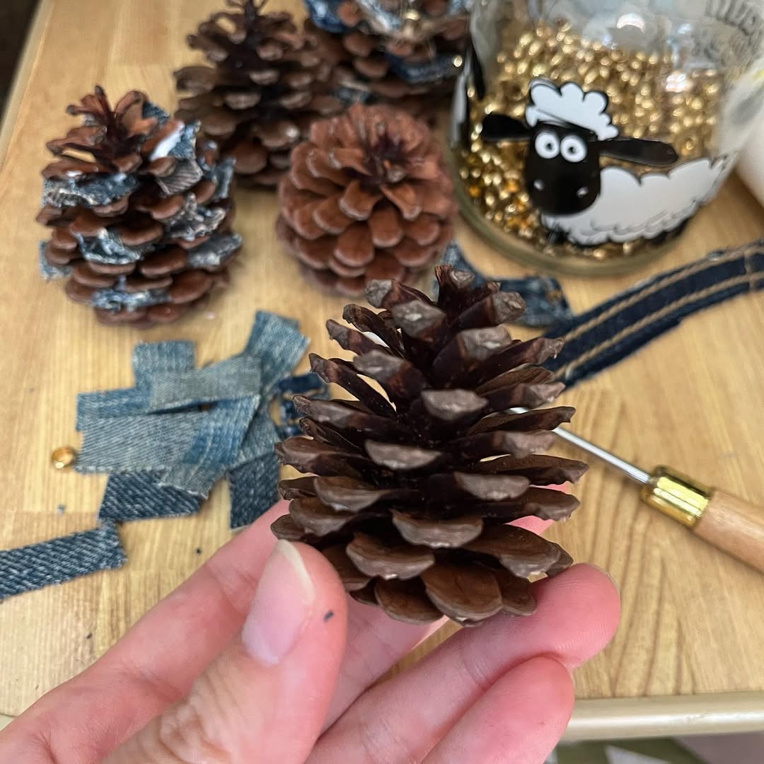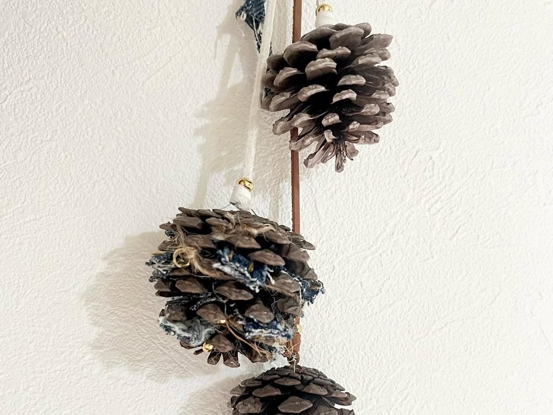 11月のイベント「@mammys.market in 銀天街」用にクリスマスっぽい雑貨を制作。琉球松の松ぼっくりにデニムを差し込んでアレンジ。